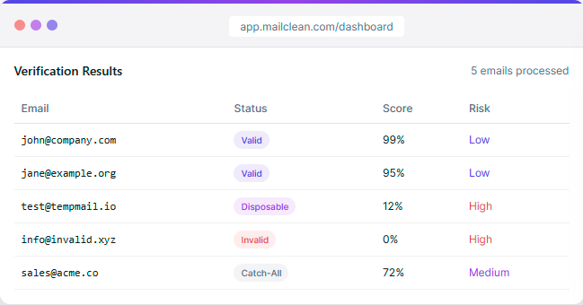 MailClean runs entirely in the cloud, so you can verify emails from anywhere, on any device. Scale from 100 to 10 million emails without worrying about infrastructure.
